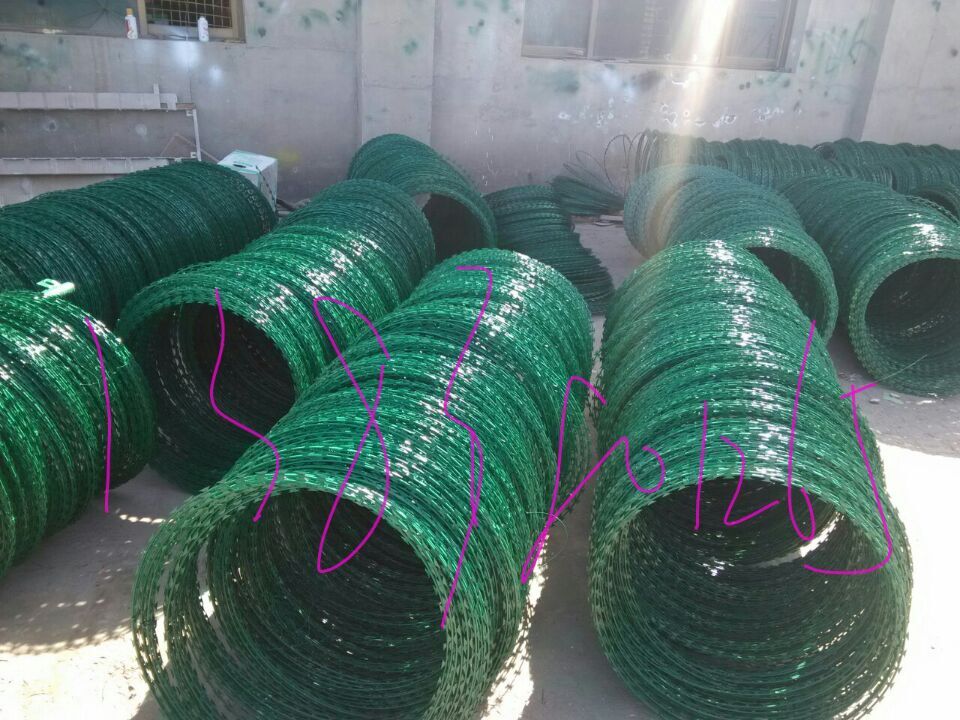 此种刀片刺网一看就令人不寒而栗,在阳光下亮闪闪的泛光,而且因为是金属的材质,还可以安装传感装置,因而是安全性能极佳的一种安全防护网。这种锋利产品刀片刺网网身刚硬,不必用张力丝和高技术工人维护,简易安装而且维护成本低。因而在军事重地,监狱,政府机构,银行,小区围墙,别墅围墙高速路,和边境线上这些安全性要求高的地方安装。厂家订购电话:0318-7756561