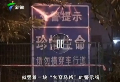 在佛山南海新干线,一女子横穿破损护栏,被迎面而过的车辆撞击而亡,在巨大的冲击下,女子撞飞好几米外,在她身边就是呼啸 而过的车辆,交警用警车阻隔,处理现场事故,撞人的车辆就停在马路中间,车灯不停闪烁,左侧已经严重损坏,目击者告诉记者,该女子是从中间破损的护栏网中 间过来的,说刚看到她踏出缺口就被飞驰而过的车辆撞飞,而在不远车,就竖着一块:“勿穿马路”警示牌子,附近居民说,这路段经常发生事故,由于附近没有斑 马线,天桥也要绕到很远的地方才有,所以有不少人为贪图方便,都会以身试险,在记者拍摄过程中,亲眼目睹了不少市民从此缺口通过,市民说,没办法,没天 桥,兜一圈子很远,所以才从这里通过的。